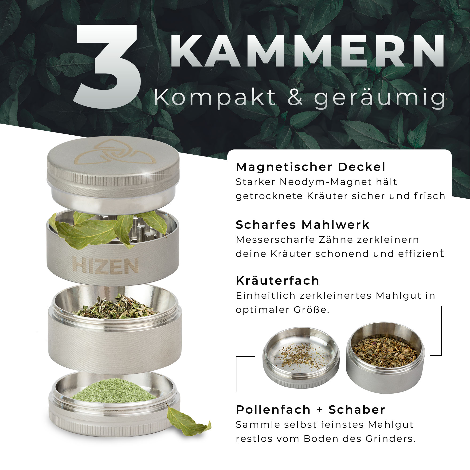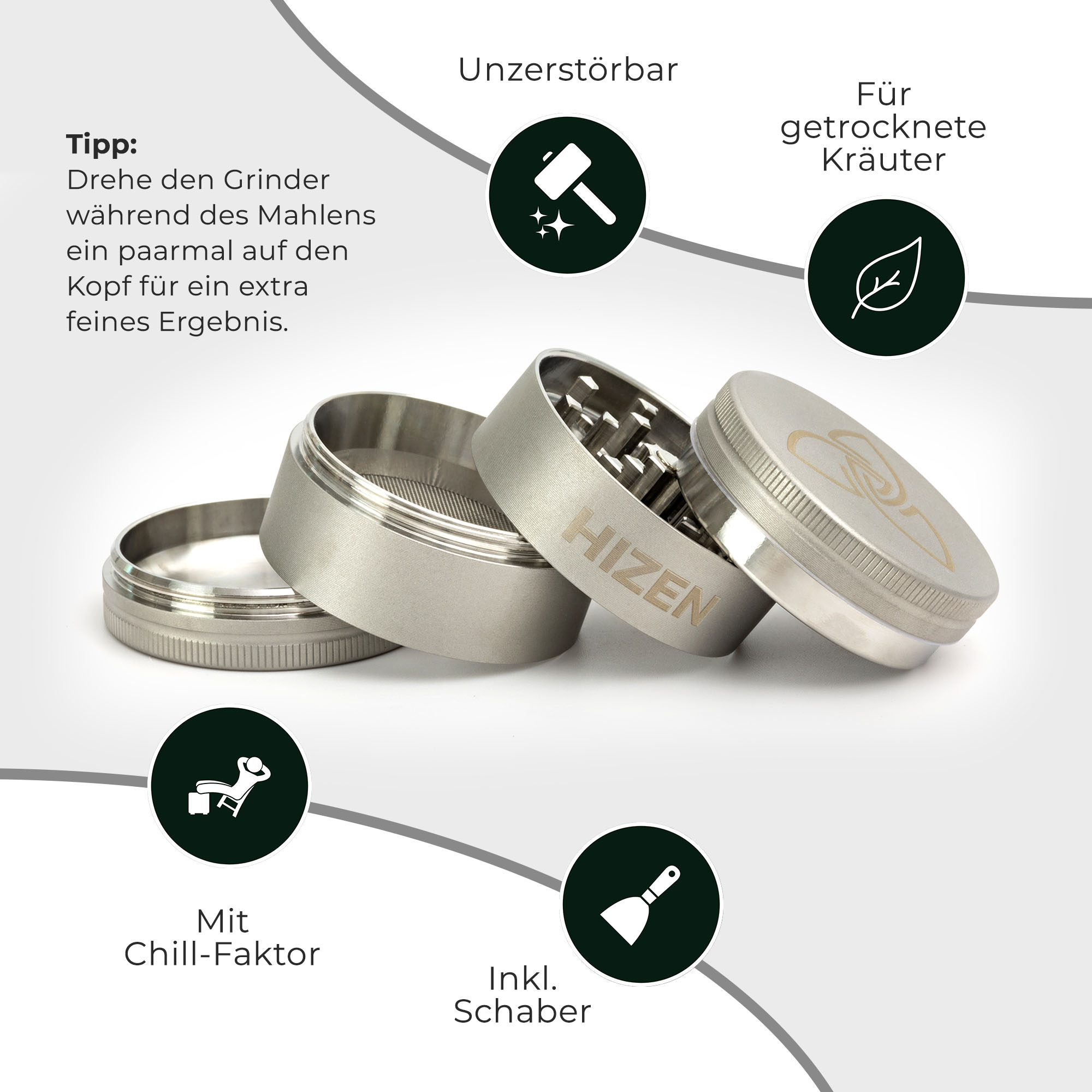 HIZEN Vaporizers Grinder Edelstahl 4-teilig, 50mm matt