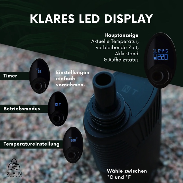 Time-Mode (T): über die Plus- und Minustaste stellst du eine Starttemperatur ein. Nach dem du eine gewünschte Starttemperatur gewählt hast, kannst du nun eine Endtemperatur, ebenfalls über die Plus- und Minustaste, auswählen. Die gewünschten Temperaturen bestätigst du dabei immer mit druck auf den Powerbutton. Nun stellst du die Dauer deiner Session, auch mit Plus- und Minustaste und Bestätigung über den Powerbutton, ein. Anschließend heizt sich dein Vaporizer auf die Starttemperatur auf und erwärmt sich über den gewünschten Zeitraum auf die Endtemperatur.